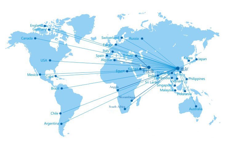 全世界各个国家和地区。目前占有市场:中国、美国、东南亚、中东、北非、南美等。至2018年11月,我们的市场除了在中国销售到25个省份之外,还进入了美国、印度尼西亚、马来西亚、孟加拉国、斯里兰卡、越南、巴基斯坦、卡塔尔、阿尔及利亚、安哥拉、莫桑比克、智利等12个国家。
